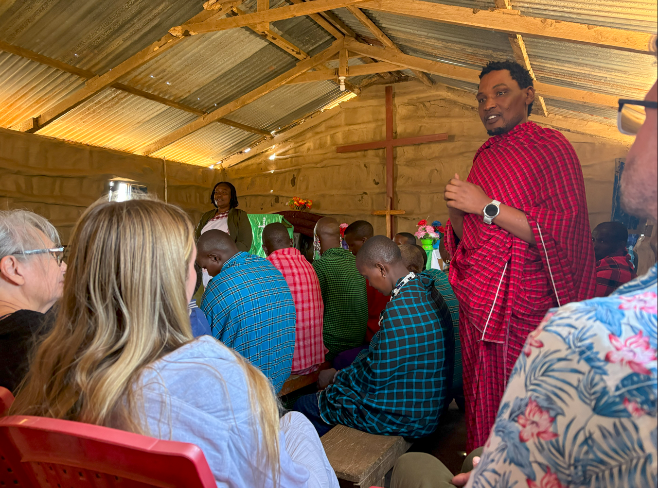 Their Maasai hosts killed and prepared a goat for them, which was a huge honor. The travelers spent the visit attending worship at Eluwai Lutheran church, drinking chai with Musa and his neighbors in his boma (a homestead made of mud, sticks, and thatch), sharing lunch, and visiting the village preschool. Musa's friend Enoty helped with translation, and the travelers were given traditional Maasai jewelry and were wrapped in Shukas (vibrant cloth worn by Maasai with rich historical and cultural significance).